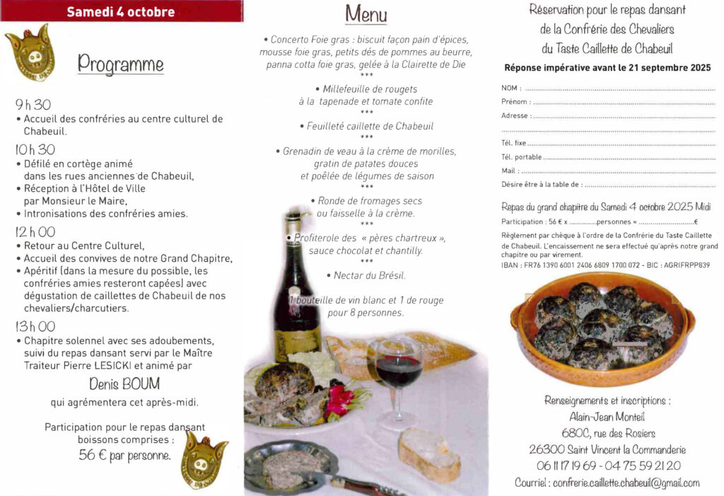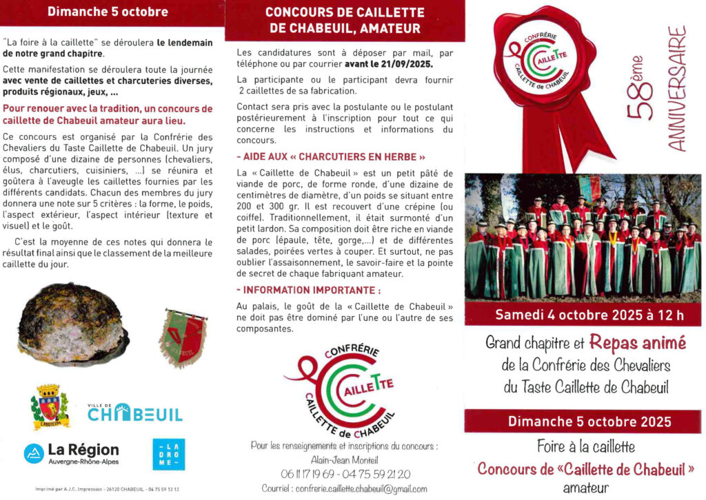 Contact : Alain-Jean Monteil au 06 11 19 69 04 ou 04 75 59 21 20, ou par email à confrerie.caillette.chabeuil@gmail.com.